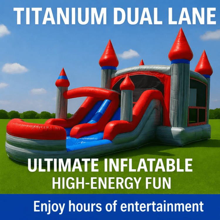 Brand new for the 2025 season! The Titanium Dual Lane Combo is the ultimate inflatable for high-energy fun — featuring a spacious bounce house, two tall slides, a basketball hoop, and a splash pad landing pool perfect for wet or dry use.