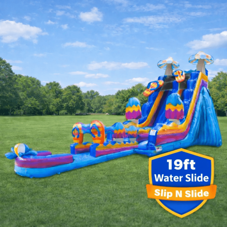 Bring big summer fun to your event with our 19’ Flip Flop Frenzy Water Slide with Slip N Slide Rental! 🩴🌴 This tropical inflatable combo features a 19-foot tall water slide πŸ§—‍♂️ that flows straight into a long slip n slide πŸ„‍♂️ for one smooth, exciting ride ending in a refreshing splash πŸ’¦.